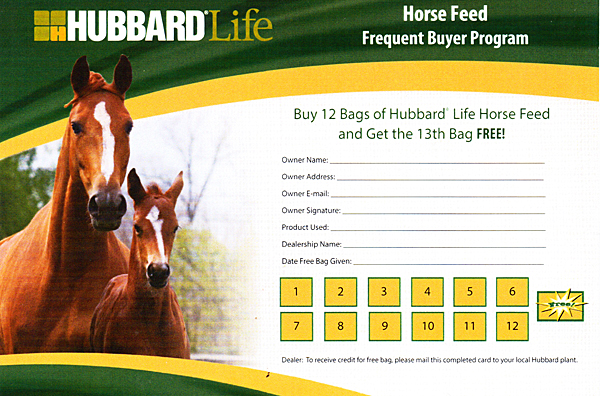 Buy 12 bags of Hubbard Life Horse Feed and get one free.